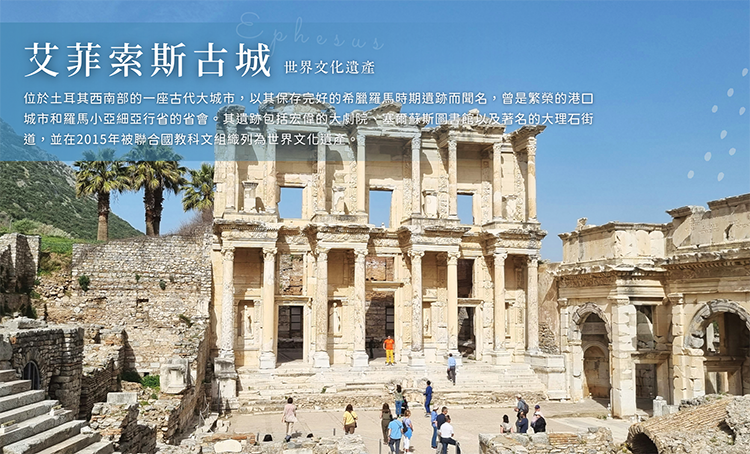 艾菲索斯由於港口的交通便利,東西貿易的興盛成為當時最繁榮的都市,並且是世界上第一座完全採用白色大理石建成的都市。是古希臘人在小亞細亞建立的一個大城市,也是愛奧尼亞人的城市,也是保存很好的羅馬古城!包括可容納2萬5千人同時觀賞表演的露天劇場、圖書館、大理石街道、古羅馬浴場、古羅馬公廁、神殿、市集、音樂廳等,從地上與牆上精緻的馬賽克瓷磚,仍可幻想出當時人類富麗堂皇的生活型態。