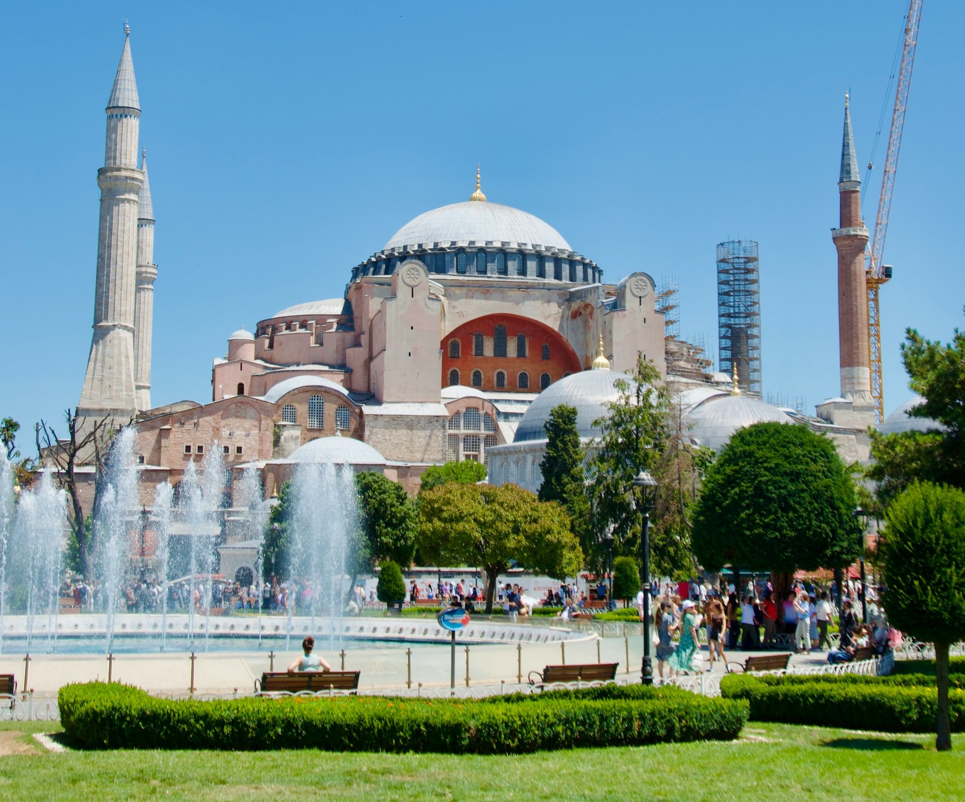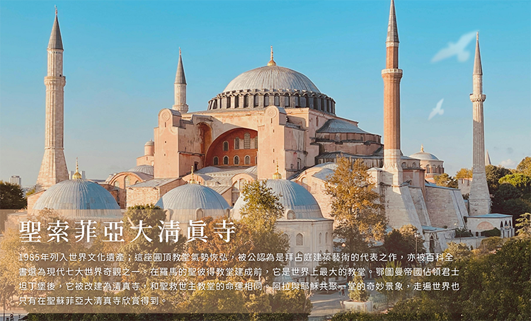本教堂建於拜占庭時代原為基督教教堂,又在鄂圖曼帝國被改為清真寺,為舉世聞名的大教堂。這座教堂見證著伊斯坦堡波瀾萬丈的歷史。其建築堪稱拜占庭的藝術傑作,金色大圓頂在陽光的照耀下顯得更加光彩奪目;於2020年7月正名為聖索菲亞大清真寺。