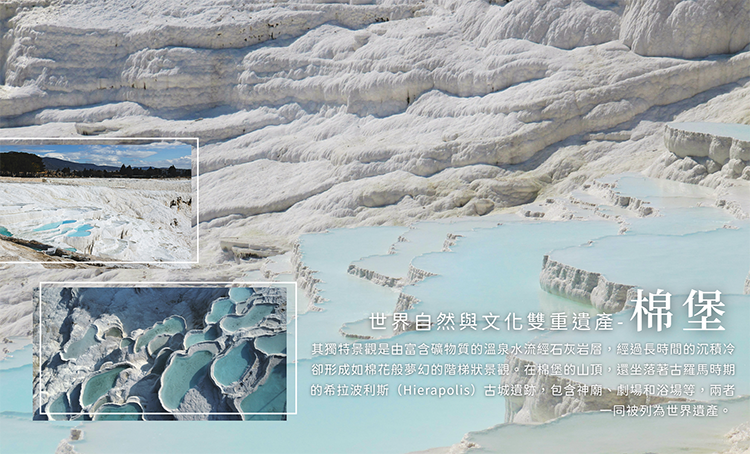 一塊一塊階梯狀,像白色棉花似的石堡,非常的夢幻~這片鬼斧神工的獨特景觀,其實是有天然溫泉從地底浮出,依著地勢聚集環流,慢慢堆積成石灰華結晶,經過千年的累積,形成梯提景觀。當陽光照拂在這片棉花田上,泉水映照出藍綠色調,穿插著白色大地,美麗又令人讚嘆的美景隨即浮現眼前。