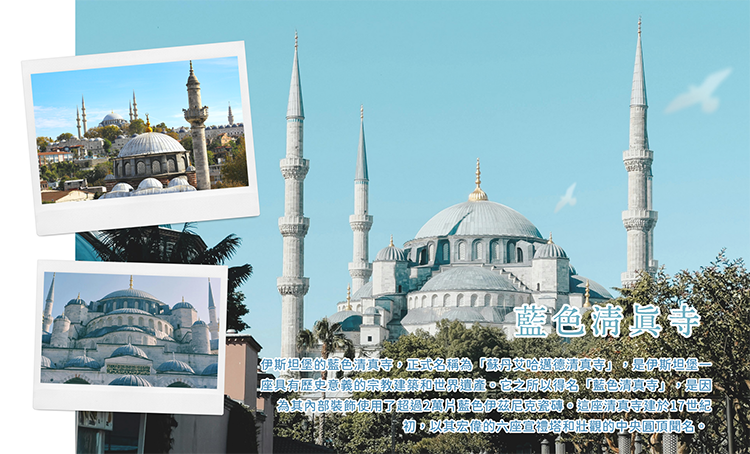 清真寺在回教世界隨處可見,但這個藍色清真寺卻是世界上最特別的,尤其以土耳其最著名的伊茲尼藍磁磚、鬱金香等鄂圖曼的花草圖騰所建造而成,它的獨特在於擁有六座叫拜塔,是世界唯一,而這獨特之處竟然是因為建築師聽錯,才造就這場美麗的誤會。