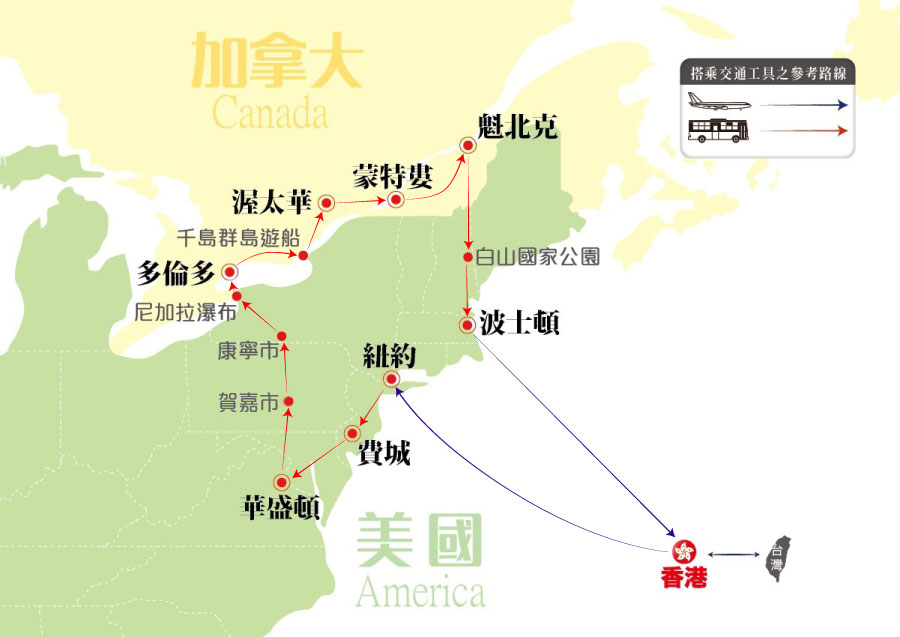 ◆ 本行程於美加地區之使用車輛,團體19人以下使用24座巴士;團體20-25人使用33座巴士;團體26人以上使用49座以上巴士。