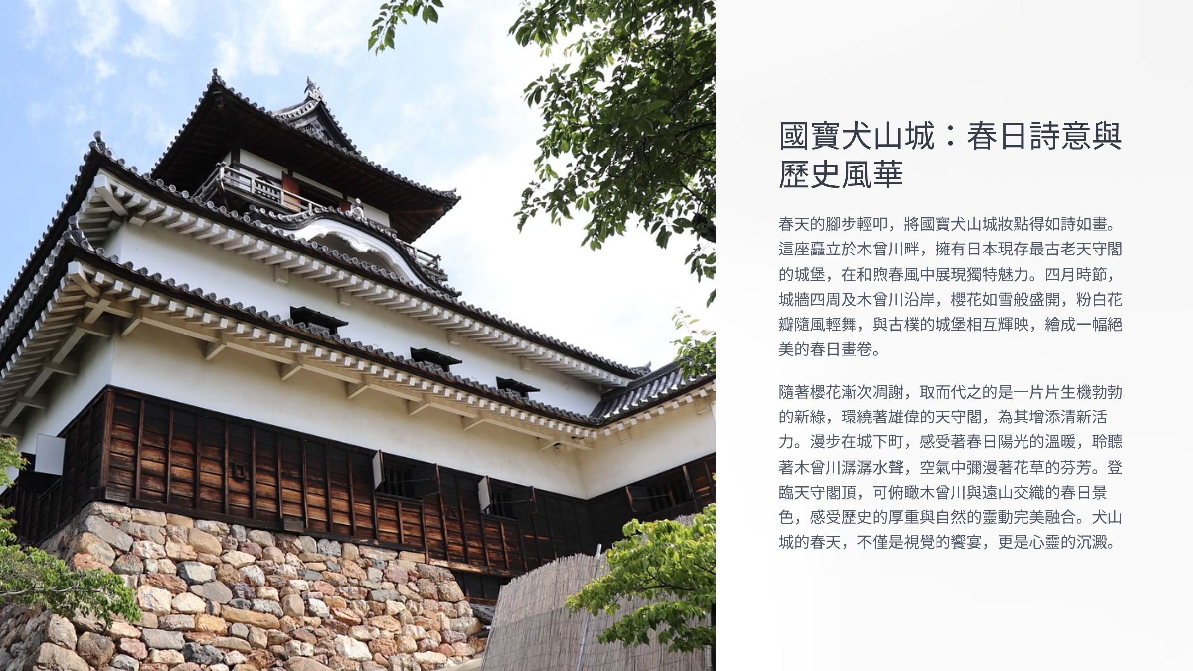犬山城是日本現存天守閣中歷史最悠久的城堡之一,被指定為國寶。冬季站在天守閣頂層,可將木曾川與遠方白雪覆蓋的山景盡收眼底,景色壯麗。