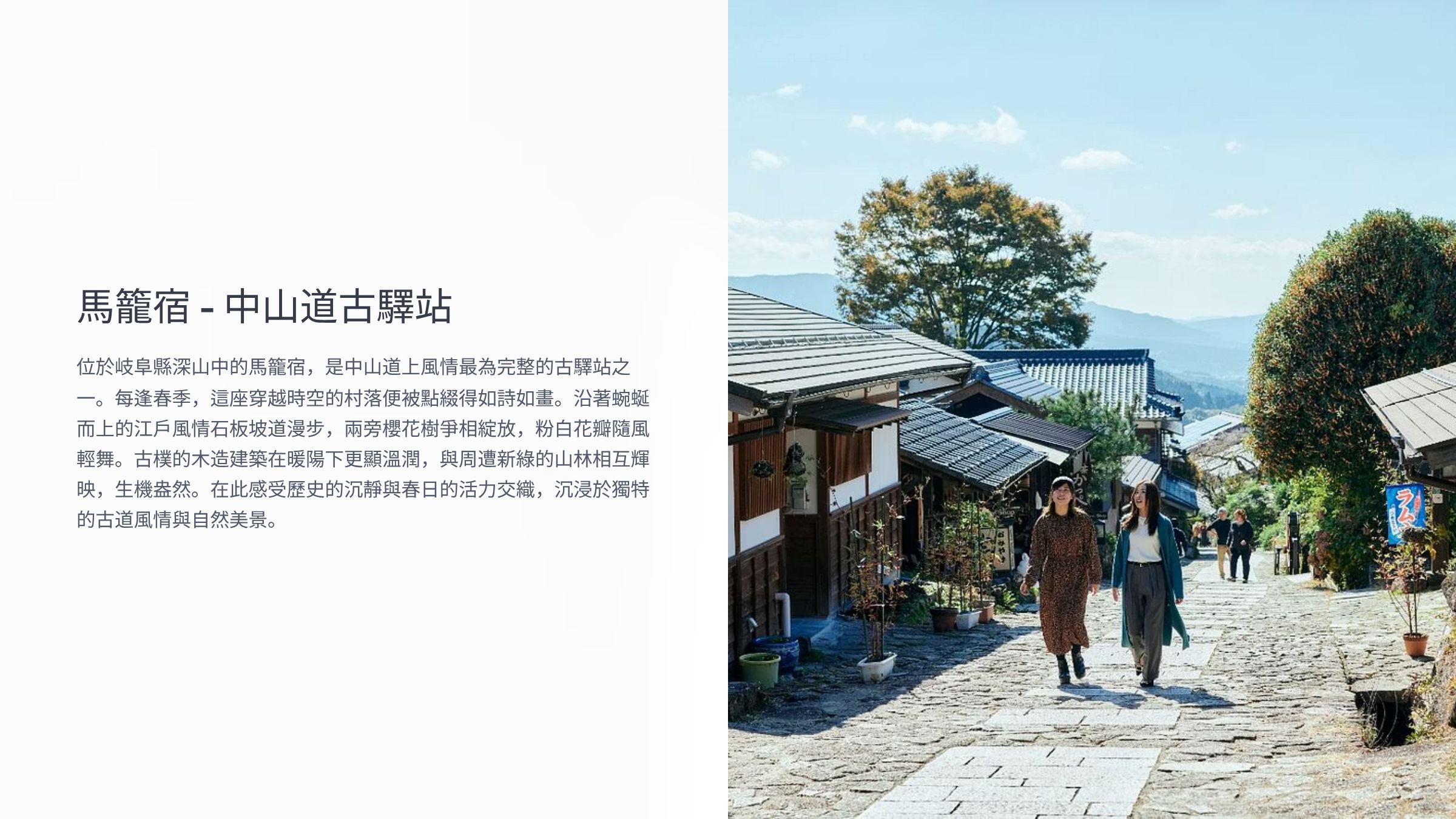 江戶時代中山道上的重要驛站,保存完好的古老街道,兩旁是傳統木造建築。冬季白雪覆蓋的馬籠宿,古樸而寧靜,適合漫步感受歷史氛圍。有許多特色小店和咖啡館。