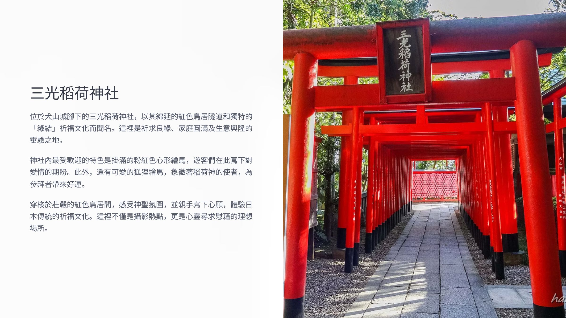 位於犬山城腳下,以其粉紅色心形繪馬和可愛的狐狸繪馬聞名,是祈求良緣和生意興隆的熱門神社。冬季參拜別有一番風味。