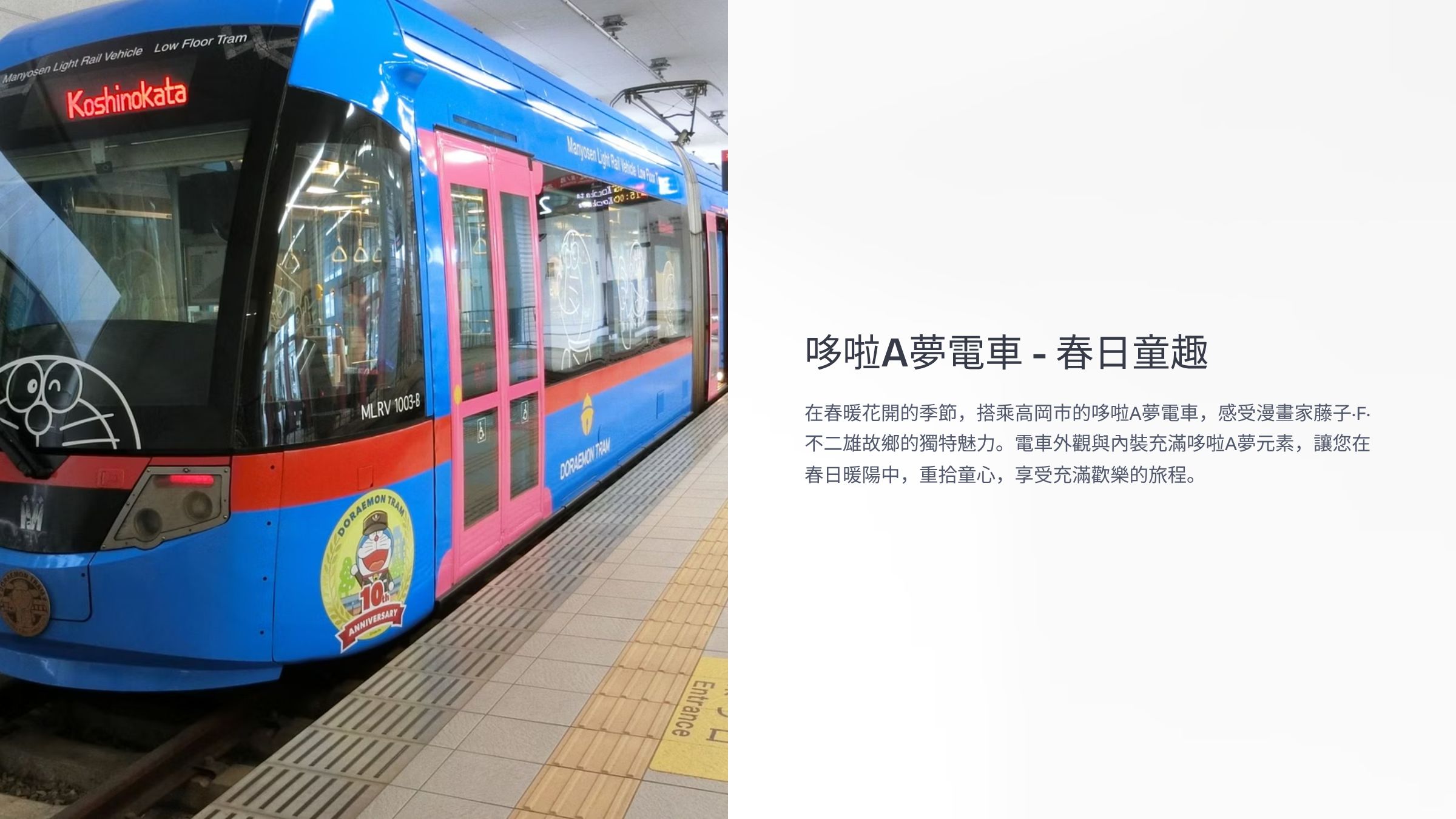 從高岡站搭乘至米島口站的特色電車,車身彩繪哆啦A夢卡通圖案,充滿童趣。